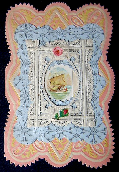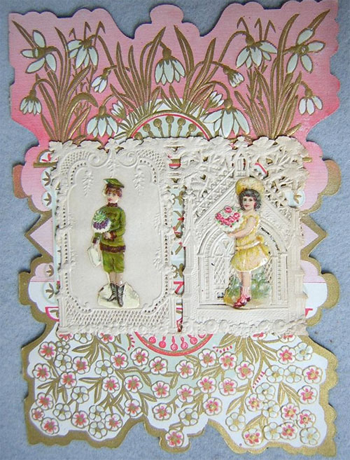 I’d call this style maximalist marzipan—almost too saccharine, but the dimensionality of the collaging and diecutting is of enduring beauty and interest. I am always touched when I see fragile ephemera in good condition. It’s poignant to peek into sentiments a century-plus old. The layering impulse is one people still have: the more lace doilies, roses, cherubs, innocent children, birds, bowers and churches you shower your loved ones with, the more you love them. Well-meant excess is a common holiday pitfall applied to food (Sandra Lee, I’m talking to you), home decorating and gift-giving. I support holiday exuberance until it crosses over into stress, peer pressure or guilt trips. I know these valentines are out of season, but I’m sure I can find a batch of Christmas cards to post next.