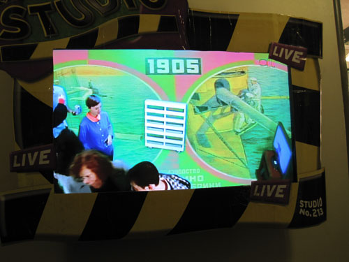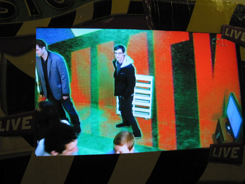 In a metatextual gesture, Nick displayed a live feed of his visitors watching his work (an odd and compelling video of him manipulating a mask). The inside of the studio had a green screen and the feed played outside in the hall.