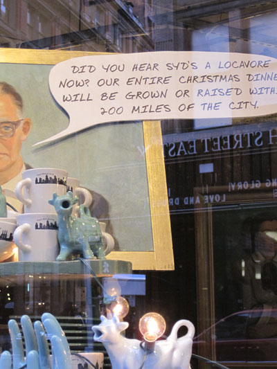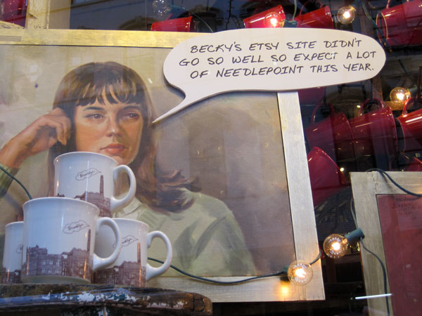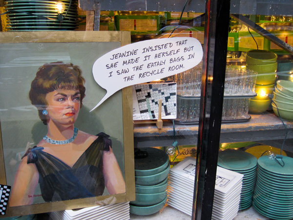 Why not pause during the course of my busy day to take pictures of the display windows at Fishs Eddy, purveyors of plates, glassware and tchotchkes? I can only hope I am less of a neurotic New Yorker than our lovely painted portrait characters, but I did get all the in-jokes (forgive the typos).