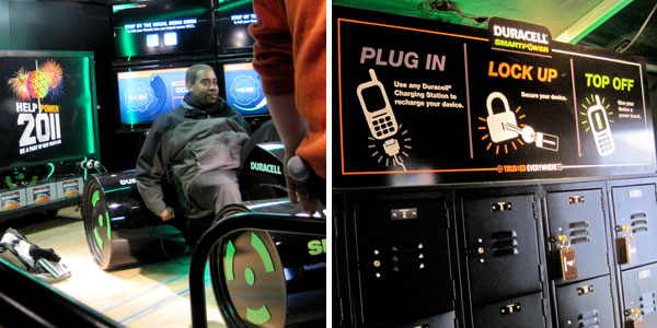 Duracell actually came up with a pretty interesting promotion. I was enticed inside the truck/tent by the offer of free batteries. Inside, people were generating pedal power (and having pictures taken and emailed to them) on recumbent bikes. Their action charged a giant battery that will light up the Times Square 2011 numerals. Smart and “actionable” PR—people were excited to be a part of something tangible and famous. I took advantage of the docking lockers to power up my iPod.