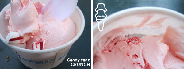 December 17. Normally I object to Red Dye #40, but I do love the pink peppermint look here. The biggest candy chunks are teeth-cracking. The first bite, where I crunch down on cane, is a little toothpastey. Whether you like this custard or not depends on how you feel about mint. The base mellows out as I eat—weirdly, I detect a marshmallow note. Most fun are the veins of pulverized candy: the flavor and texture of those areas are most user-friendly. DOUBLE SCOOP